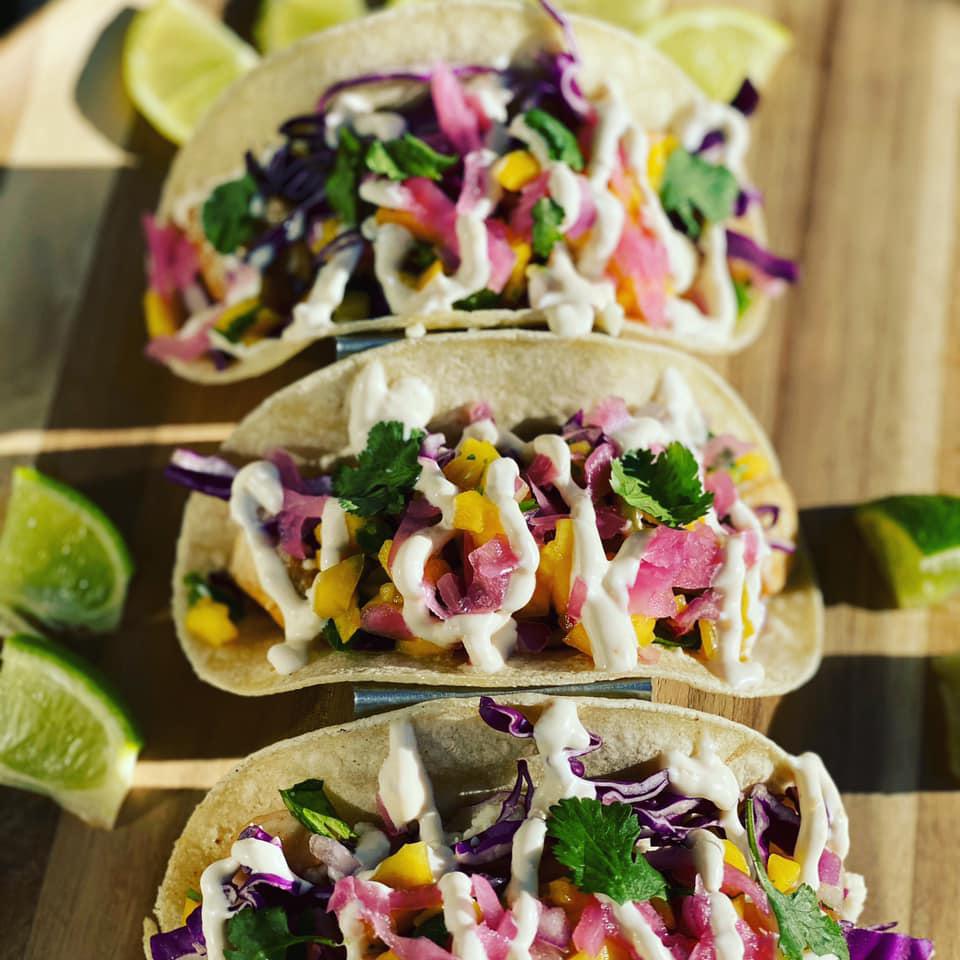 3 corn tortillas filled with grilled mahi mahi, shredded purple cabbage, cilantro, cotija cheese, mango salsa, pickled red onion and drizzled with garlic lime aioli.